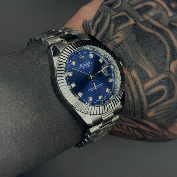صفحه آبی این ساعت با نشانگرهای درخشان و طراحی کلاسیک، خوانایی مناسبی دارد و در کنار نمایشگر تاریخ کارایی بیشتری برای استفاده روزمره فراهم میکند. بند استیل مقاوم با قفل طرح فابریک رولکس نیز باعث میشود ساعت بهراحتی روی مچ دست قرار بگیرد و احساس کیفیت و استحکام را منتقل کند.