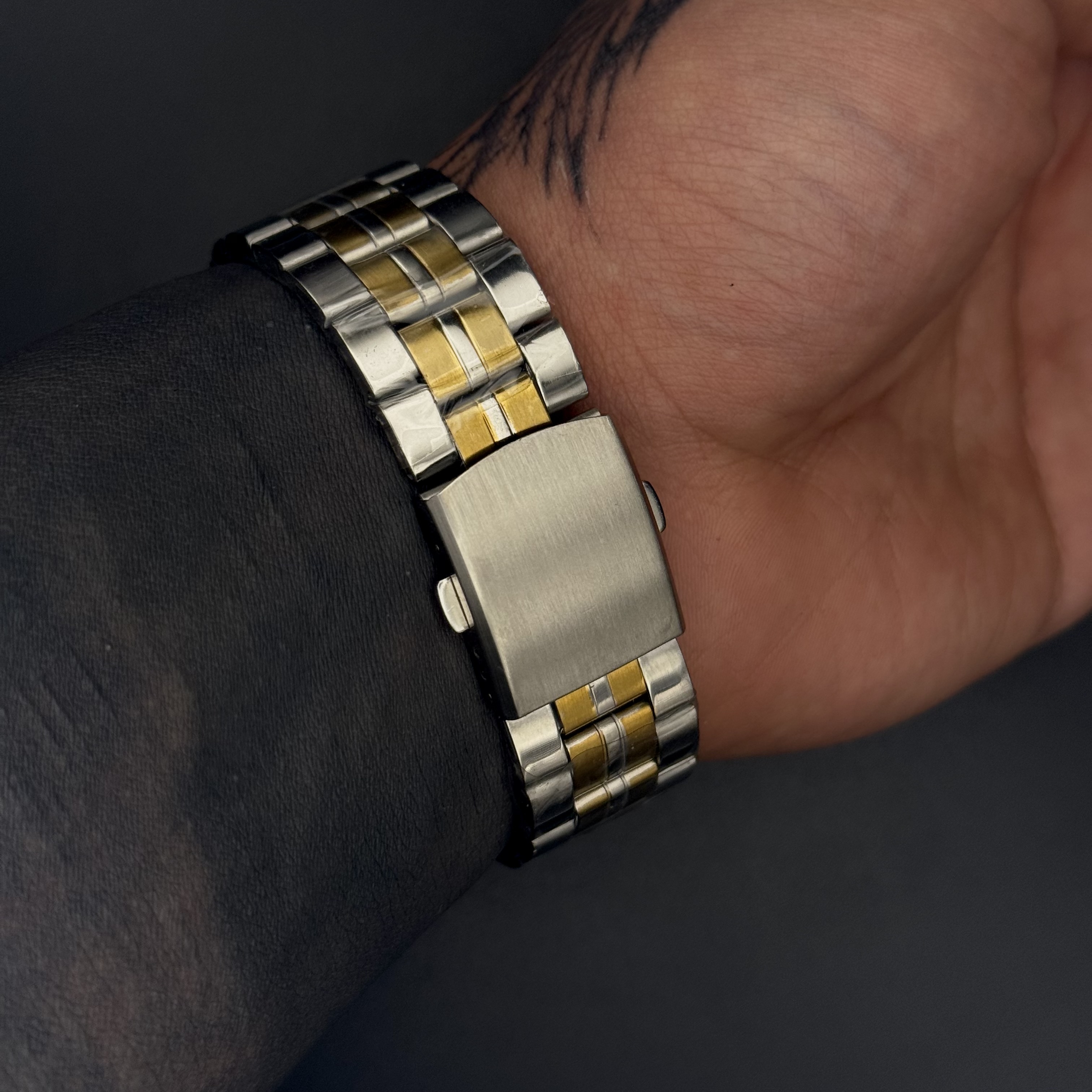 صفحه مشکی با جزئیات طلایی جلوهای لوکس ایجاد کرده و بند دو رنگ باعث شده ساعت روی مچ بسیار شیک و متفاوت دیده شود.
