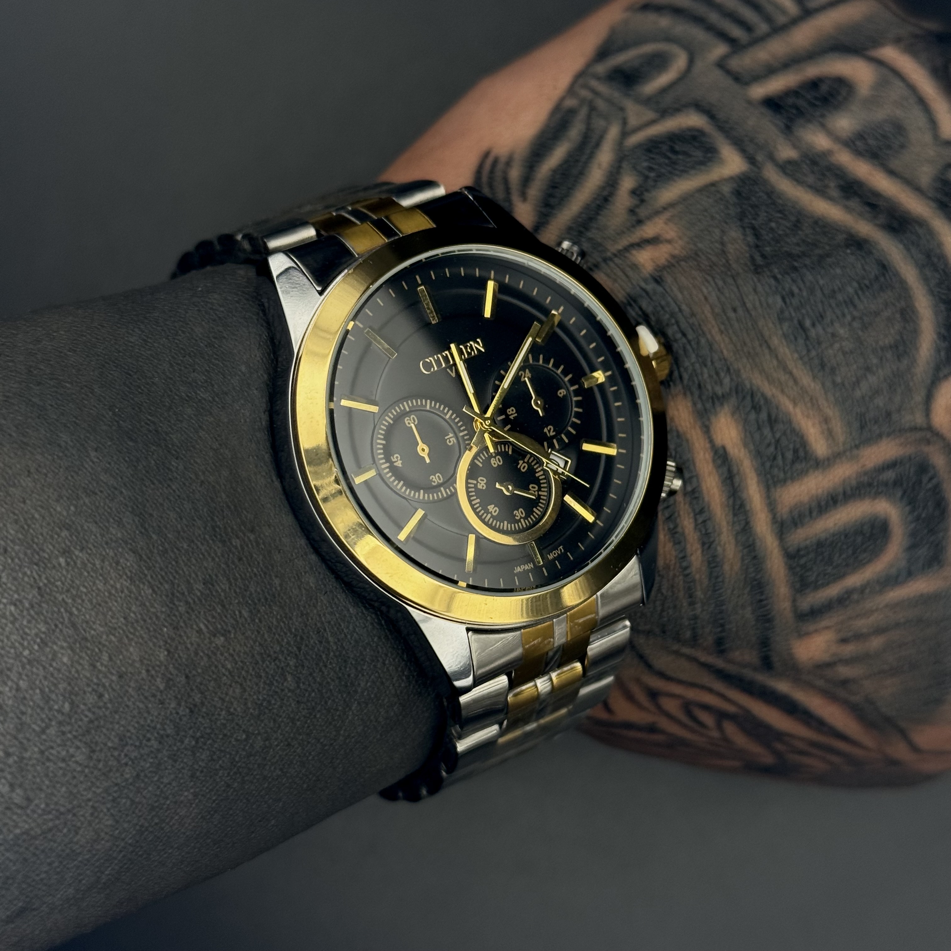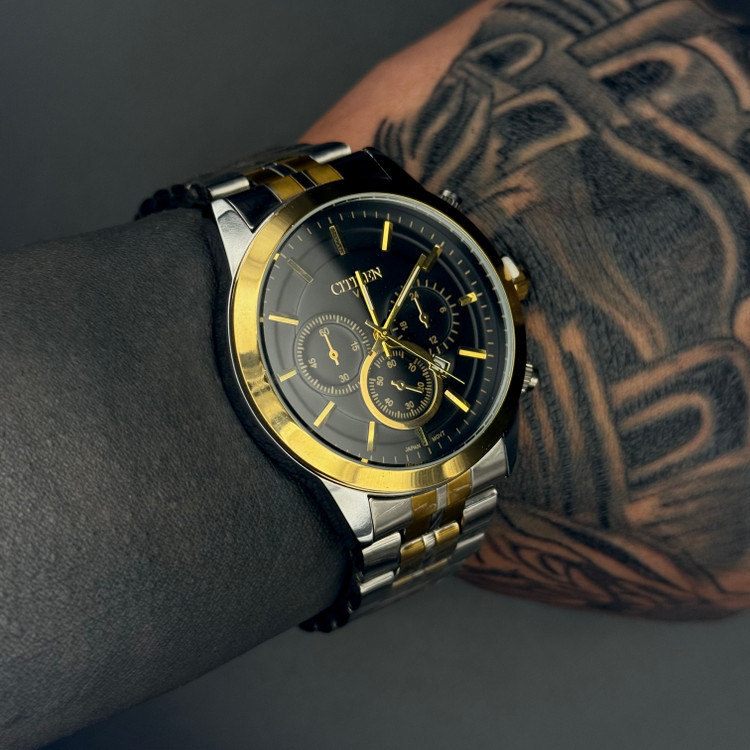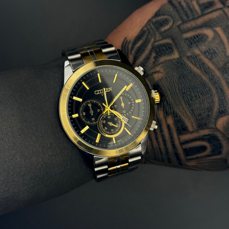 ساعت مچی مردانه سیتیزن VIP مدل BS_07 یکی از مدلهای شیک و چشمگیر در میان ساعتهای مردانه است که با ترکیب رنگ جذاب طلایی و نقرهای روی بند استیل، ظاهری لوکس و رسمی ایجاد کرده است. صفحه مشکی با جزئیات طلایی و طراحی سهچشم تزئینی جلوهای حرفهای و مردانه به این مدل میدهد و باعث میشود روی دست بهشدت نمایان و خاص باشد.