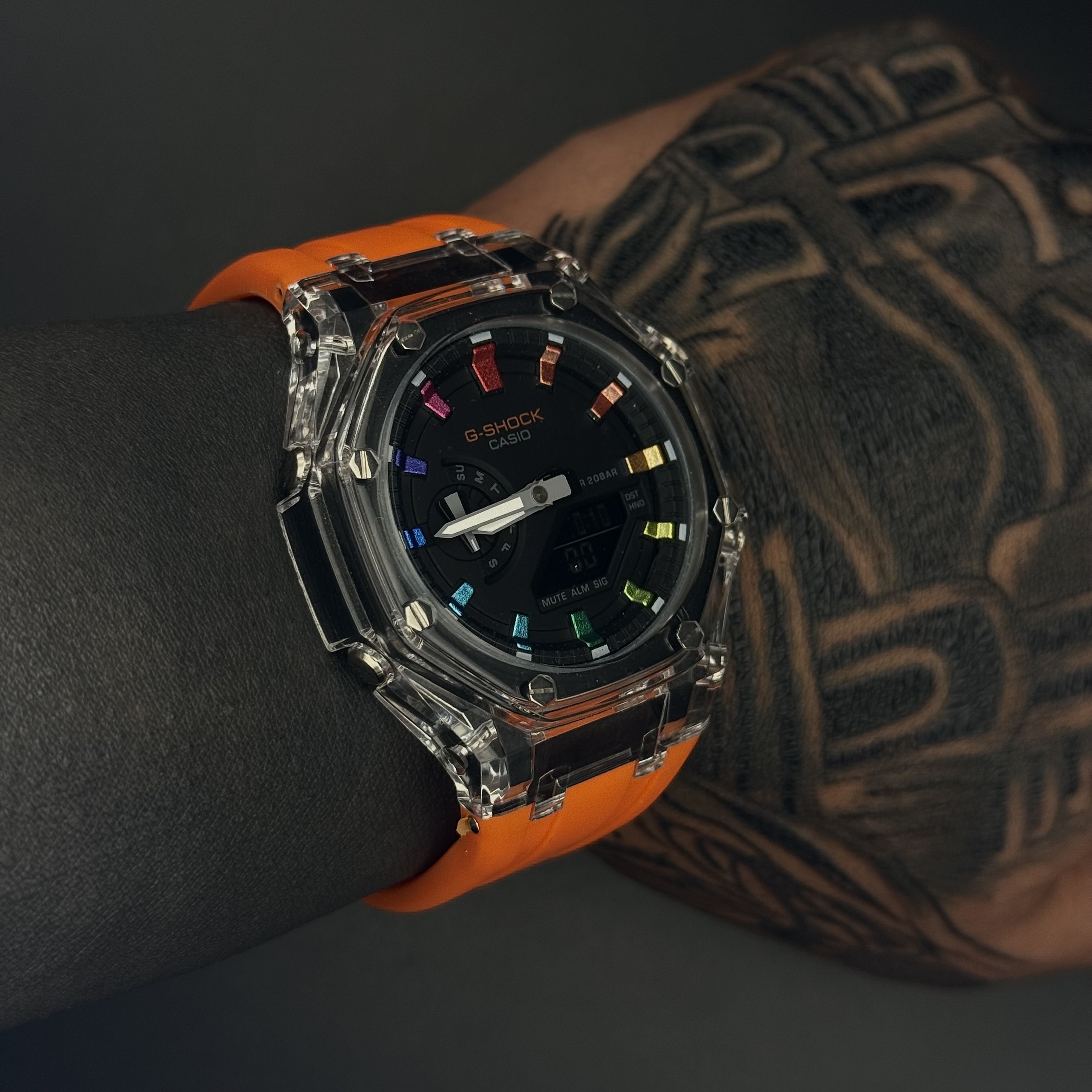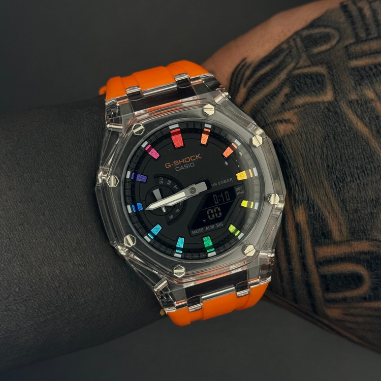 ترکیب بند نارنجی با بدنه شفاف و صفحه مشکی باعث شده این ساعت ظاهری بسیار خاص و اسپرت داشته باشد.